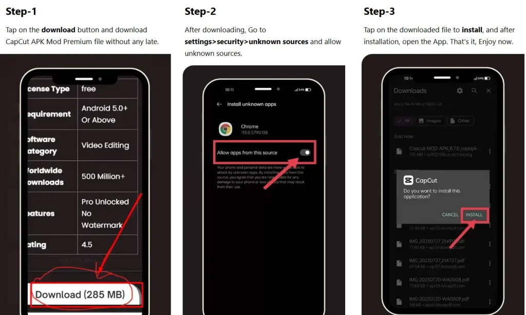 Download & Install CapCut Pro APK on Android, iOS, and PC are as given bellow,